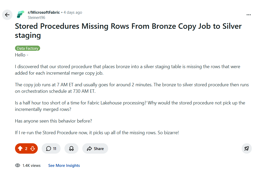 Similar to the failed Copy Job pipeline story I shared a few weeks ago, I turned to the r/MicrosoftFabric subreddit community. And once again, they came through.